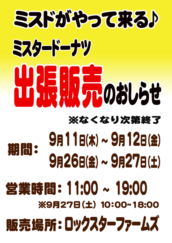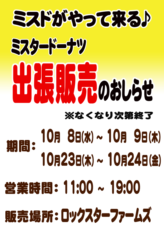 カテゴリー別に見る イベント ニュース ROCKSTAR-FARMS (更新日)2025.10.01 【ロックスターファームズ】ミスタードーナツ出張販売のお知らせ (更新日)2025.09.29 10月イベントカレンダー (更新日)2025.09.29 【ロックスターファームズ】お得な情報のお知らせ (更新日)2025.09.29 【ロックスターファームズ】ROCK BREAD FAIR (更新日)2025.09.18 【ロックスターファームズ】東北日進堂 催事のお知らせ (更新日)2025.09.16 【ロックスターファームズ】お得な情報のお知らせ (更新日)2025.09.10 【ロックスターファームズ】お得な情報のお知らせ (更新日)2025.09.09 【ロックスターファームズ】ミスタードーナツ出張販売のお知らせ (更新日)2025.09.08 【セントラルスポーツ ジムスタ】9月キャンペーンのお知らせ (更新日)2025.09.08 【セントラルスポーツ ジムスタ】秋の温活キャンペーン (更新日)2025.09.06 【ロックスターファームズ】8739マフィン販売 (更新日)2025.09.06 【ロックスターファームズ】黒沢牧場フェア開催 12345...102030...最後 »