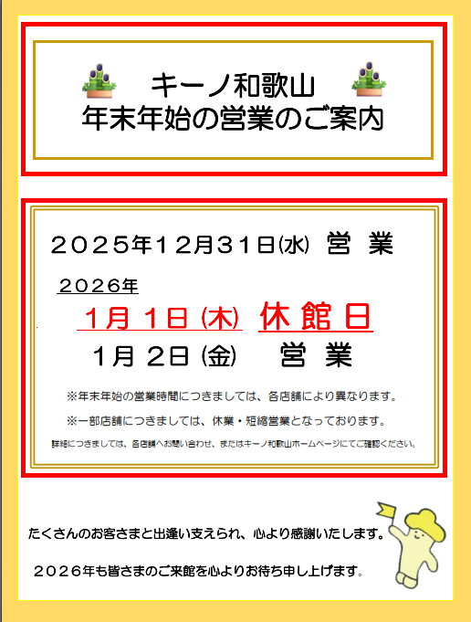 2025.12.10更新 【年末年始の営業のご案内】 ※年末年始の営業時間につきましては、各店舗により異なります。 ※一部店舗につきましては、休業、短縮営業となっております。ご利用になられる際は、各店舗にお問合せ・ご確認ください。 一覧へ