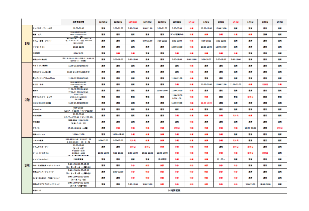 2025.12.30更新 年末年始・営業時間のお知らせ キーノ和歌山内の店舗、サービス・クリニック各店の年末年始の営業日は、下記のとおりでございます。※各店舗にて直前に変更の可能性がございます。詳しくは店舗へご確認をお願いいたします。 一覧へ